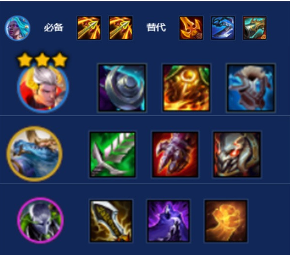 劫配备无尽、夜刃、正义;高爆发暴击流配置,秒杀对方后排关键棋子。