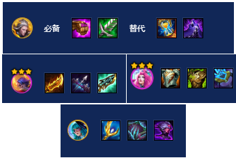 可酷伯作为主坦,配备蓝甲、龙牙、狂徒,前期蕾欧娜带肉装过渡。